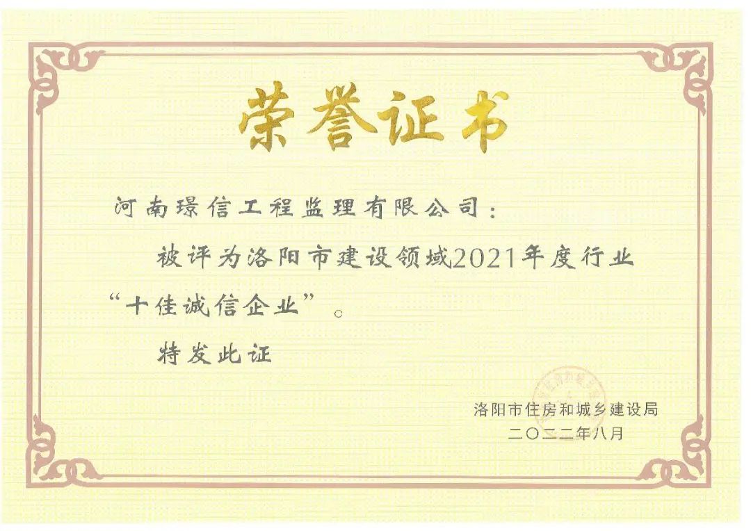 近日,在洛陽市住建局舉辦的2021年度建設領域行業(yè)十佳誠信企業(yè)和誠信先進個人評選活動中,河南璟信榮獲“十佳誠信企業(yè)”稱號,公司總經(jīng)理劉國鋒榮獲“誠信建設先進個人”稱號。 “先王貴誠信。誠信者,天下之結也”——《管子·樞言》。他認為誠信是凝聚...