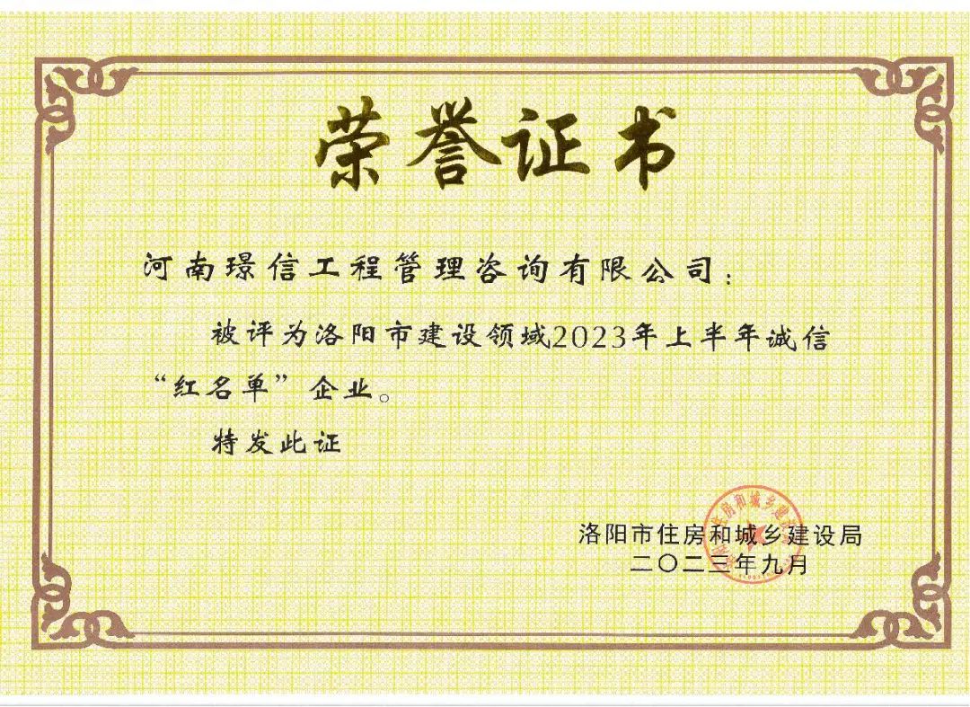 2023年9月13日,河南璟信工程管理咨詢有限公司榮列洛陽市住房與城鄉(xiāng)建設(shè)局建設(shè)領(lǐng)域2023年上半年誠信“紅名單”企業(yè)。 自參與“紅名單”評(píng)選活動(dòng)以來,公司一貫堅(jiān)持誠信經(jīng)營的核心模式得到了各級(jí)主管部門的肯定,連續(xù)多年榮登紅名單企業(yè)名...